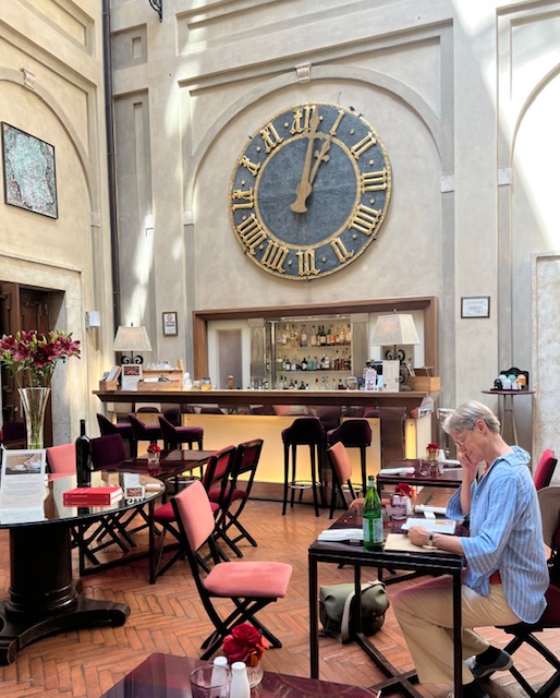 For lunch we retraced our steps to the via Banchi di Sopra to find the entrance to our apartment of last year, and to inspect the Grand Hotel Continental almost next door in which David’s Wine Scholar Guild’s tuscan tour will stay next April. It enjoys a great position so close to the Campo, and has a magnificent interior, which we were able to enjoy as we lunched in its bar!