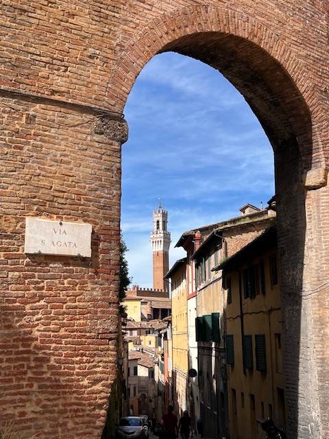 We headed away from the very busy roads leading to the Campo, and walked north on the pedestrianised via Camollia, full of eateries and local young people. We ate well at Osteria la Piana, and then walked down the via Francigena into the still heaving campo, to see the magnificent Palazzo Pubblico with the moon shining brightly above it in the very warm night.