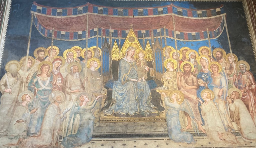 However, there is no doubt that Simone Martini painted the Maestà on the south-facing wall of this room, only a few years (1315, and reworked 1320) after that of Duccio was carried in procession on an ox-cart through Siena’s streets to the Cathedral’s high altar. This Maestà is a fresco – less expensive, faster to produce, far above viewers’ heads, and in now poor condition. (Info on Duccio’s great masterpiece follows shortly)