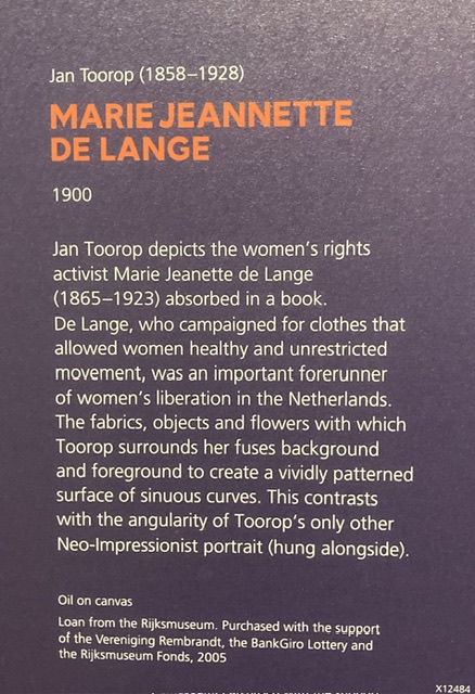 And finally Jan Toorop (1858 – 1928)’s work, painted almost a decade later, offers further developments, especially in the representation of the casual, loosely and comfortably clothed Marie Jeanette de Lange, already well-known for her commitment to women’s emancipation.