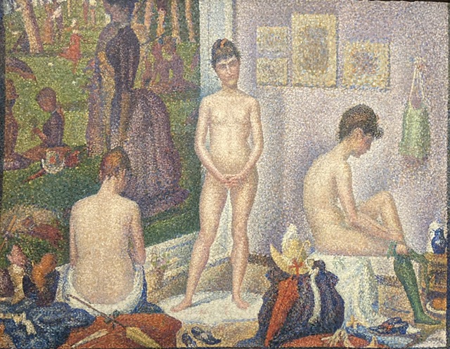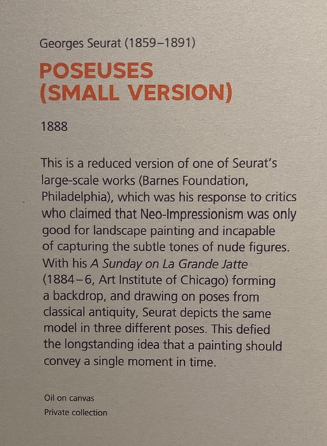 Georges Seurat (1859 -1891) gained his reputation with Bathers at Asnieres (1884) and A Sunday Afternoon on the Island of la Grande Jatte (1884-5) which heralded the move on from Impressionism. These paintings were not part of the exhibition (though the latter figures as a backdrop in one that is – Poseuses)