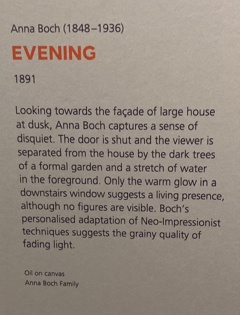 Anna Boch (1848 – 1936)’s Evening (1891) contrasts in so many ways, notably its scale, and its detail