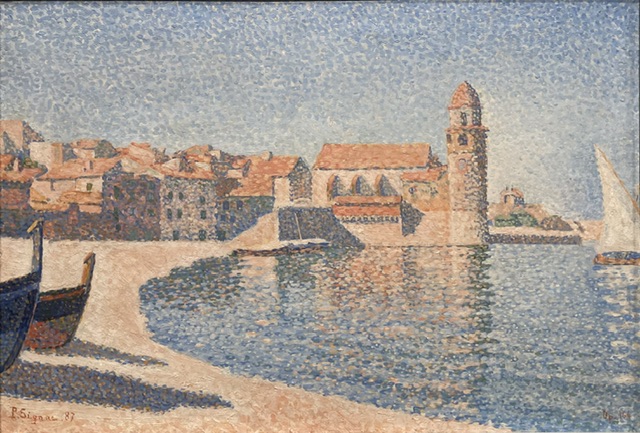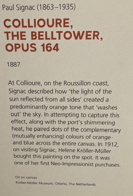 Paul Signac (1863 -1935) ) ‘s painting The Belltower at Collioure (1887) shone in the first room of the exhibition, and his very different much large piece Sunday dominated a later room.