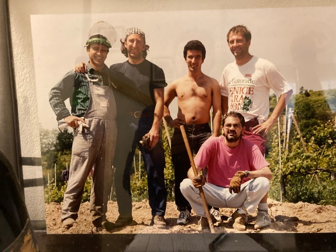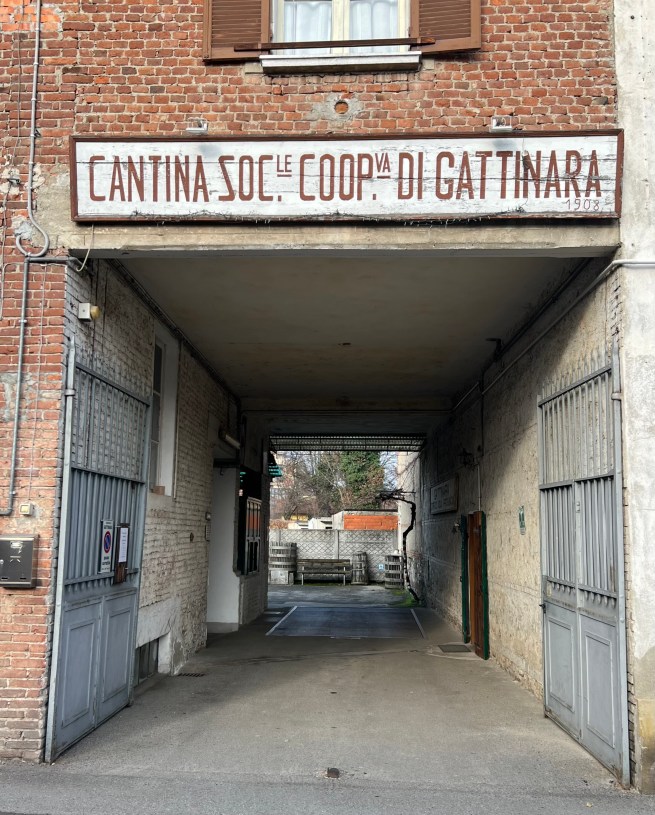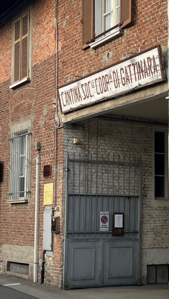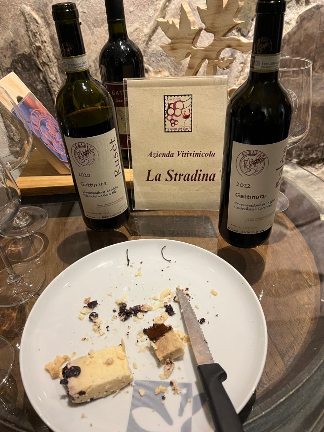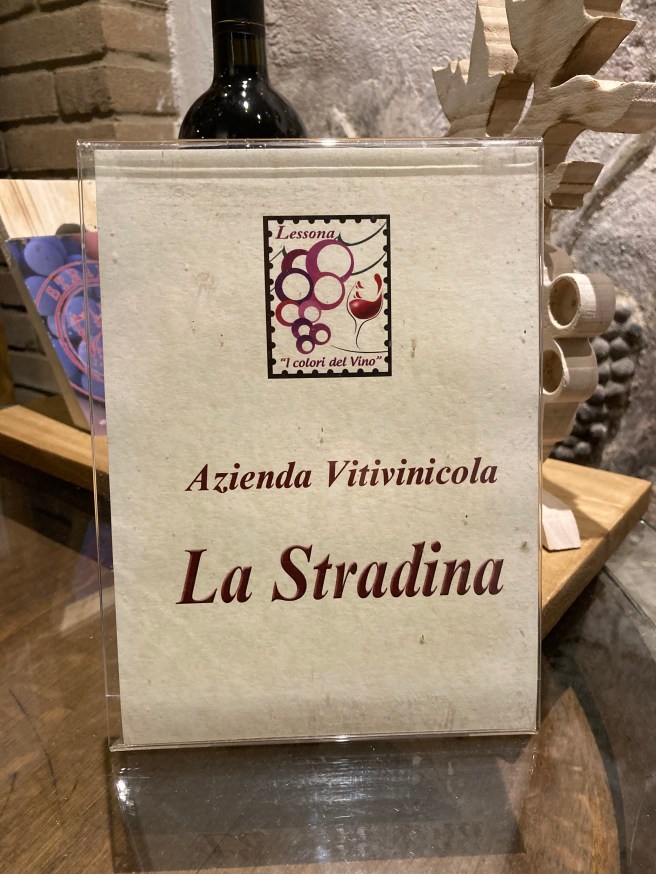 We drove back to Gattinara, for a 18.30 appointment at La Stradina. We met two of the five long-standing friends who together created this micro-winery and who in childhood played together in the local street – hence the name La Stradina. The family of the enologist in the group, who now lives in Turin, owned very small parcels of Gattinara vineyards, including San Francesco, and the domestic cellar of this family is now the cantina of La Stradina, just a few houses along the via Vittorio Veneto from our kind Dottoressa Mia Pia Fila who had sorted out David’s shingles last year.