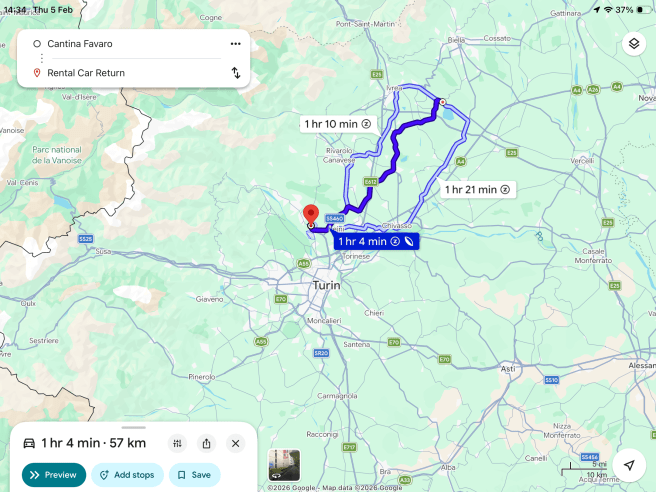 We tried to find lunch in EatItaly, but it was very busy with Italian Sunday diners. In the end we returned to the food section of the Lingotto Mall to eat a poke bowl and a guacamole on toast, after which we took the underground back to Porto Susa, and walked for an hour or so while David listened to Chelsea’s game against Crystal Palace. After a cafe stop, we waited for Emmy from Roletto to arrive, to ferry us out of Torino.