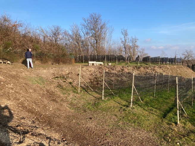 Anzivino winery had resisted all David’s attempts to contact them to taste, but having spotted that they offered tastings for their Agriturismo guests, we had arranged to stay the night there, not least as Simona had no space. We parked as instructed on the road outside, and walked to the coded side gate off the road we had chanced in November’s San Martino parking challenge. So far so good. Emanuele greeted us, seemed less than confident of sleeping arrangements, but became clearer during the tour and tasting. He is very attached to two (very different) dogs!