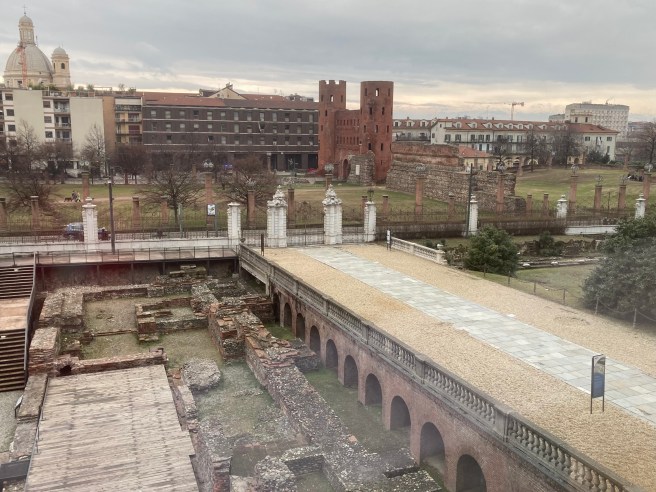 Instead we bought tickets for the Palazzo Reale whose scale and opulence (think giant Victorian bling) was overwhelming. Staircases, throne- ball- and dining- rooms all gilded and stuffed with tapestries, paintings and gilt furniture and mirrors. Napoleon, and later the House of Savoy were responsible for so much of Torino’s grand architecture, and the latter provided the first king of the Kingdom of Italy in 1860, Vittorio Emanuele I. We headed for the art of 1350 – 1500, and had a fine view of the Roman archeological site out of the washroom’s window