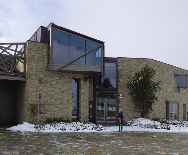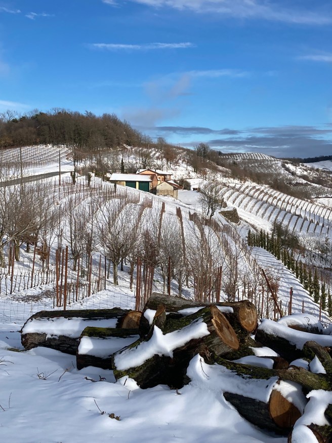 The snow was deeper here, at nearly 700m, so Giovanni took us in Gaia Gaia’s e-car to see their new vineyards below Cascina Langa, and than a tour of their fortress-like new build, now buried deep in the hillside under the spoil from the enormous excavation. We then had a strange tasting of six unfinished white wines including Sauvignon Blanc, Pinot Bianco, Chardonnay and a blend of SB and Chardonnay.