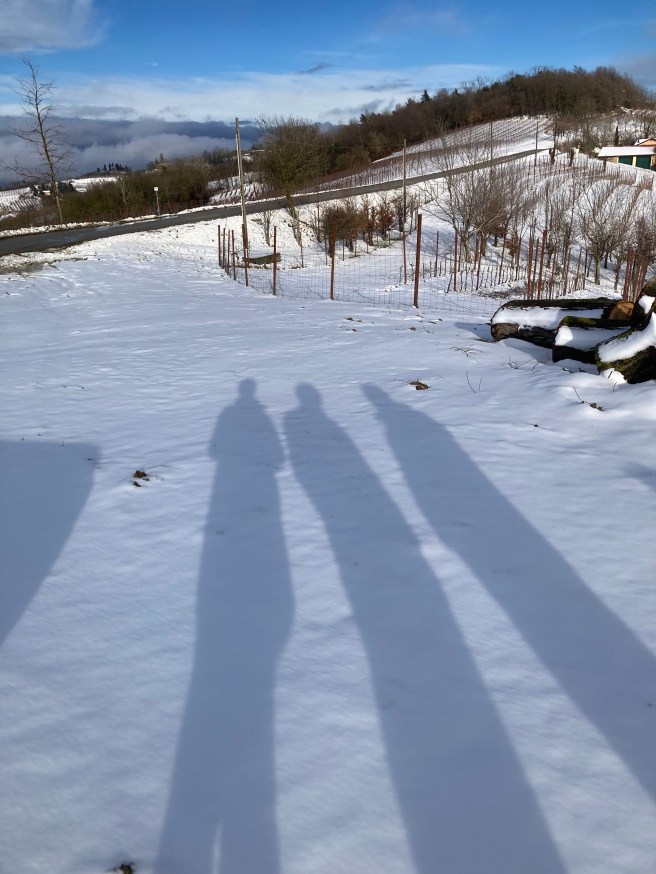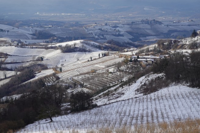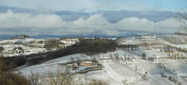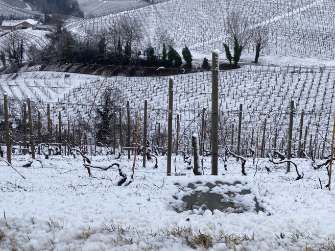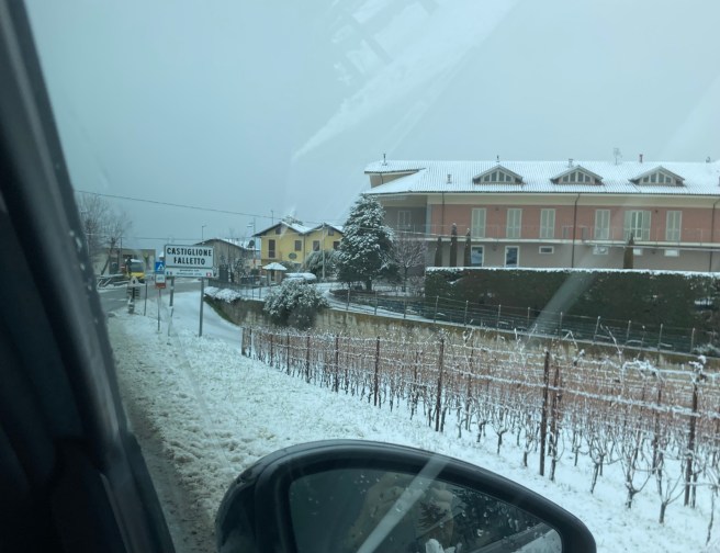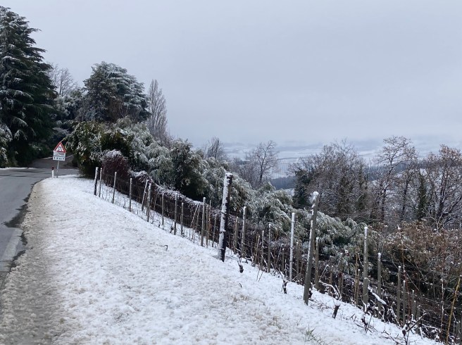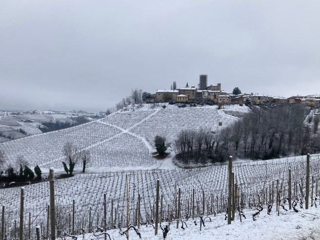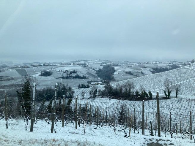 David rang Aldo Conterno to warn them we were late. The snow had eased, and the lower roads were well swept, but as we drove up towards Monforte, directed by Google to use the more direct if minor route, the snow was more evident.