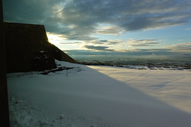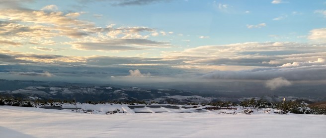 We woke to wet snow falling. Breakfasts continue to improve and we were making good time until David spotted the absence of his credit card. After searching suitcases and bags, he rang Luigi to warn him that I might be the nominated driver, and we set off slightly disturbed. Luigi was content with a debit card – he really couldn’t be nicer – and we then spent five minutes looking for the car, before taking the now completed motorway, passing several snow ploughs as we drove.