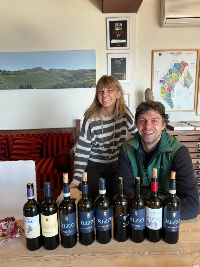 By contrast, today was a bright, sunny day for our excursion to Rizzi above San Rocco d’Elvio on edge of Alba doc but whose wines are Barbaresco DOCG. As we arrived on this spectacular ridge we bumped into Sara from Cherasco, a friend of our hostess. Iolo is the daughter of Ernesto who created the winery in 1974, and though she and her brother Enrico now do all the day to day running and marketing, working very hard, Ernesto at 86 continues to have his say.