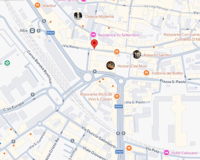We left at 17.30 to walk sedately to collect our luggage, wrap the map in the windscreen protector and thence to catch the 18.29 train to Alba. So far, so good. As the train approached Alba, we spoke with an American woman whose horror at the parlous state of the USA eclipsed ours. She owns the hotel at Sinio, and was keen to add David’s book to her resources there. She has alot of wine enthusiasts stay as her guests. We three had an unpleasant encounter with a very disturbed, out of it young man as we left the station; the second unpleasant episode of this kind of our visit.