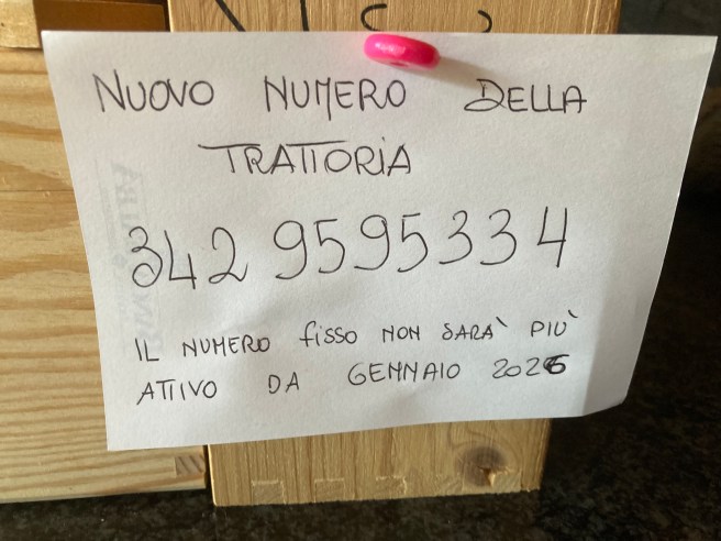 As we arrived in Treiso, at around 400m, where the snow was deeper, we saw a vehicle skidding and slipping badly on a drive just a metre from the cleared road, but we resorted to a nearby car park under a vast conifer where there was little snow, grateful that the trattoria Risorgimento was open. (Note its new phone number, below, stuck to the till). Here we met Marco Simonet, who David declared to be ‘the man who made pruning sexy’ to his companions’ amusement, having met him at an MW event years ago.