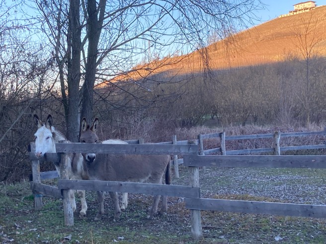 As we waited for an old telegraph pole to be removed by a lifting vehicle blocking our exit, alongside two curious donkeys, I wondered exactly where does Alba end and Barbaresco start? The line of the river Elvio perhaps?