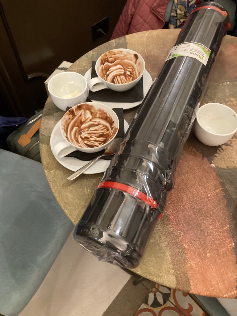 Our attention turned to the challenge of conveying the large Langhe map by aircraft. The young women on Reception had furnished us with a few possible places to look, and after cadging a cardboard tubo from a print shop, we found Bottegaccia, an Art shop on via Pertinace which had a purpose made plastic cylindrical protector. It looked sinister, but was exactly what we needed.